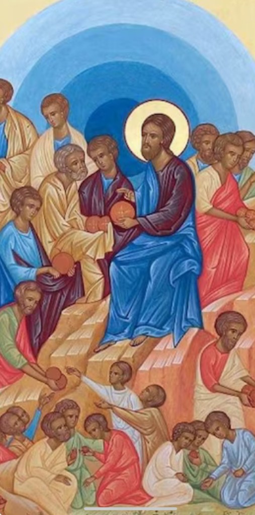 It was late afternoon when the Twelve came to him and said, ‘Send the people away, and they can go to the villages and farms round about to find lodging and food; for we are in a lonely place here.’ He replied, ‘Give them something to eat yourselves.’ But they said, ‘We have no more than five loaves and two fish, unless we are to go ourselves and buy food for all these people.’ For there were about five thousand men. But he said to his disciples, ‘Get them to sit down in parties of about fifty.’ They did so and made them all sit down. Then he took the five loaves and the two fish, raised his eyes to heaven, and said the blessing over them; then he broke them and handed them to his disciples to distribute among the crowd. They all ate as much as they wanted, and when the scraps remaining were collected they filled twelve baskets.