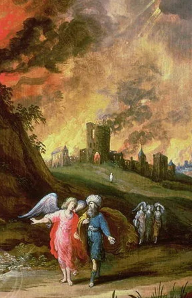 As the sun rose over the land and Lot entered Zoar, the Lord rained on Sodom and Gomorrah brimstone and fire from the Lord. He overthrew these towns and the whole plain, with all the inhabitants of the towns, and everything that grew there. But the wife of Lot looked back, and was turned into a pillar of salt.