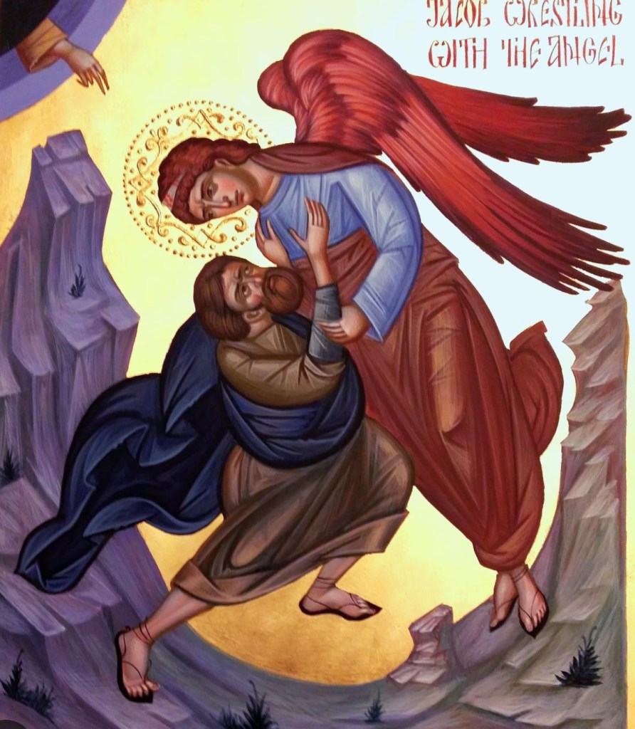 And there was one that wrestled with him until daybreak who, seeing that he could not master him, struck him in the socket of his hip, and Jacob’s hip was dislocated as he wrestled with him. He said, ‘Let me go, for day is breaking.’ But Jacob answered, ‘I will not let you go unless you bless me.’ He then asked, ‘What is your name?’ ‘Jacob’, he replied. He said, ‘Your name shall no longer be Jacob, but Israel, because you have been strong against God, you shall prevail against men.’ Jacob then made this request, ‘I beg you, tell me your name’, but he replied, ‘Why do you ask my name?’ And he blessed him there.