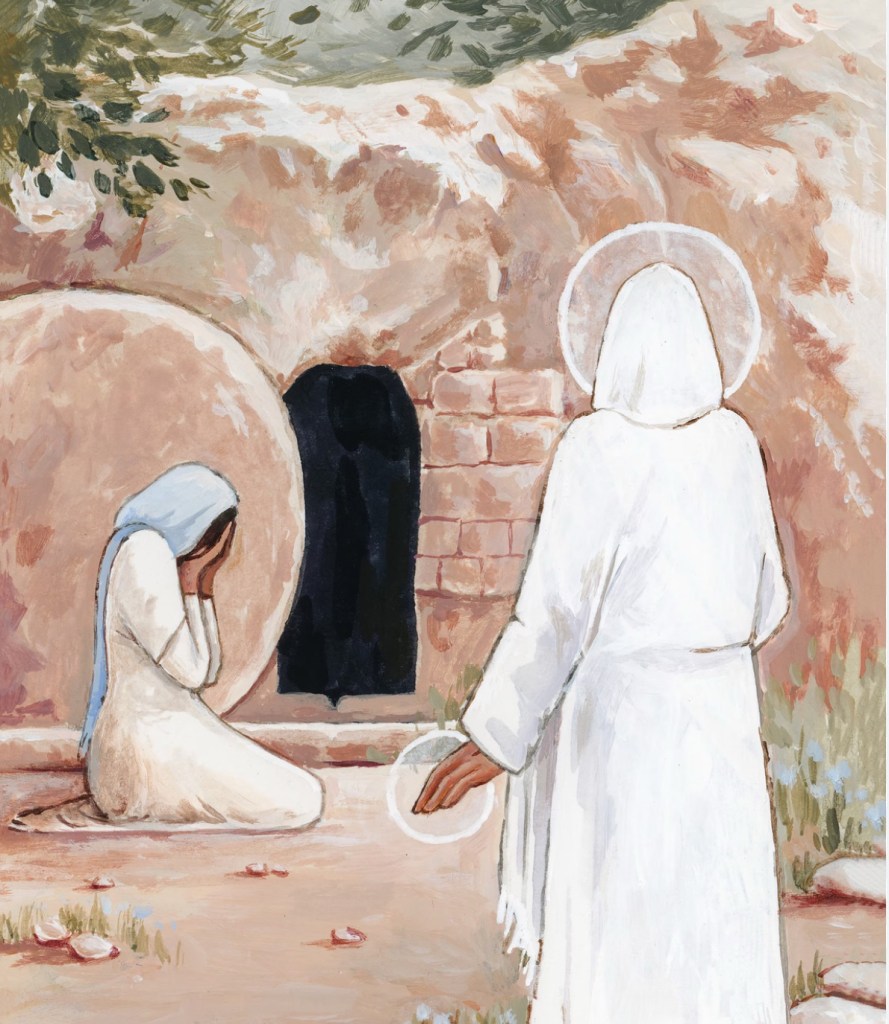 Meanwhile Mary stayed outside near the tomb, weeping. Then, still weeping, she stooped to look inside, and saw two angels in white sitting where the body of Jesus had been, one at the head, the other at the feet. They said, ‘Woman, why are you weeping?’ ‘They have taken my Lord away’ she replied ‘and I don’t know where they have put him.’ As she said this she turned round and saw Jesus standing there, though she did not recognise him. Jesus said, ‘Woman, why are you weeping? Who are you looking for?’ Supposing him to be the gardener, she said, ‘Sir, if you have taken him away, tell me where you have put him, and I will go and remove him.’ Jesus said, ‘Mary!’ She knew him then and said to him in Hebrew, ‘Rabbuni!’ – which means Master. Jesus said to her, ‘Do not cling to me, because I have not yet ascended to the Father. But go and find the brothers, and tell them: I am ascending to my Father and your Father, to my God and your God.’ So Mary of Magdala went and told the disciples that she had seen the Lord and that he had said these things to her.