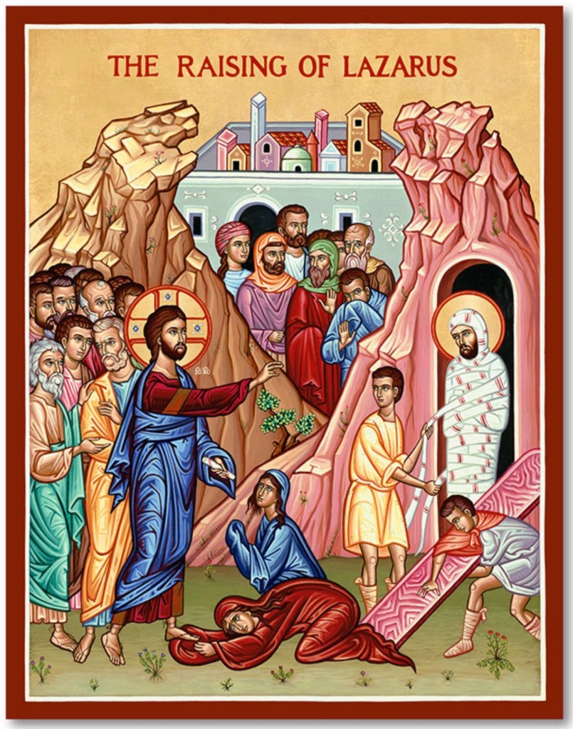 When he had said this, he cried in a loud voice, ‘Lazarus, here! Come out!’ The dead man came out, his feet and hands bound with bands of stuff and a cloth round his face. Jesus said to them, ‘Unbind him, let him go free.’